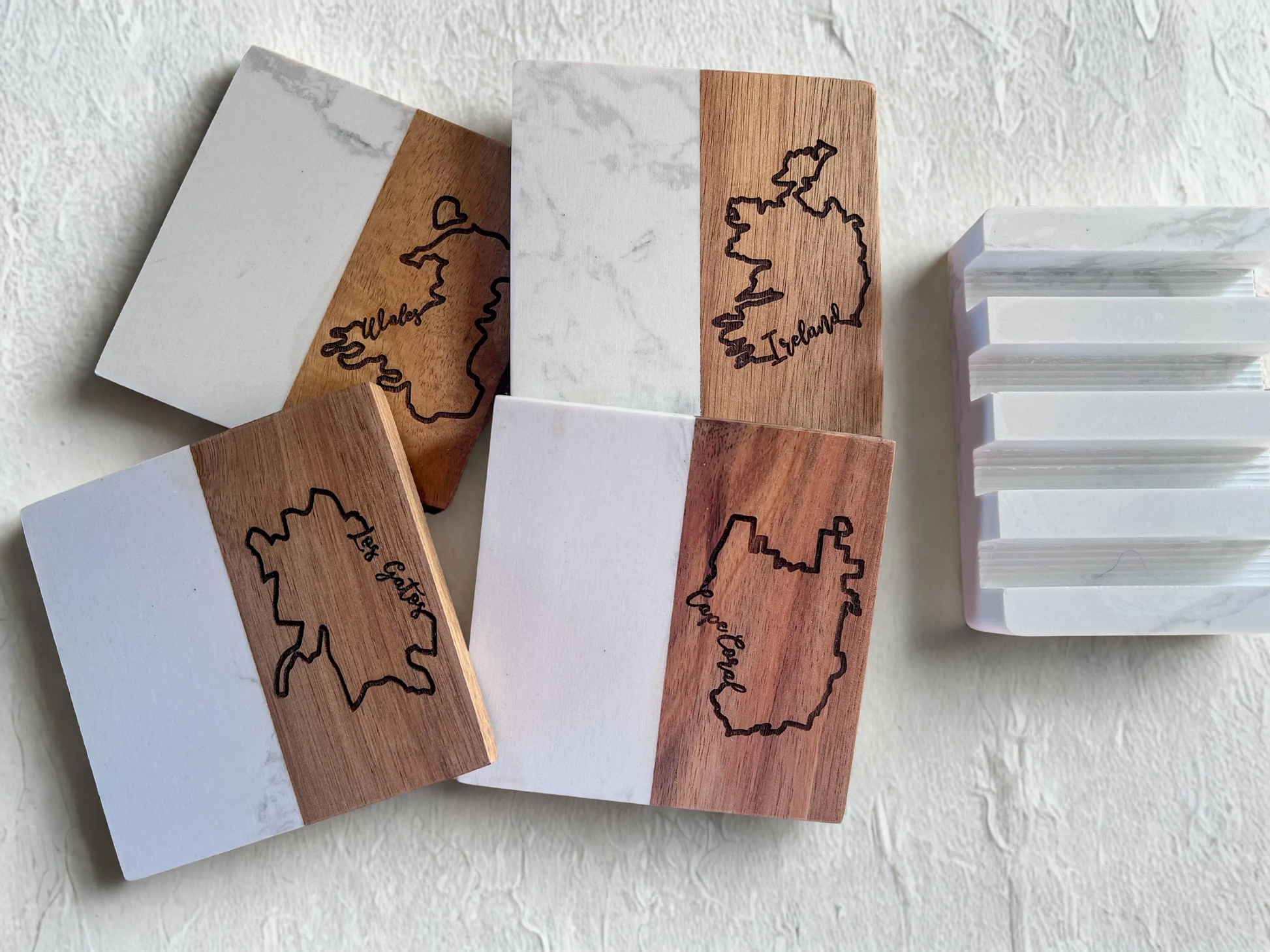 Each set includes four coasters and a coordinating white marble stand for a clean, modern display.