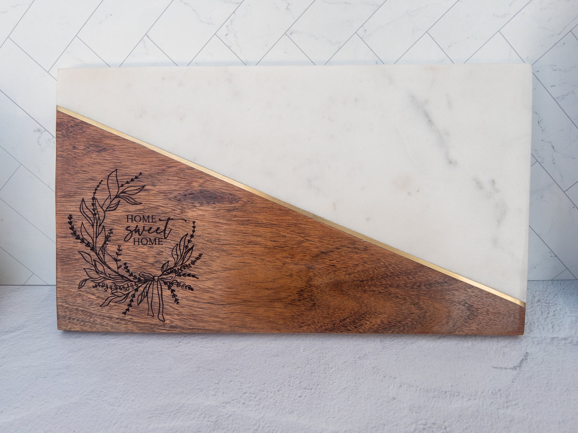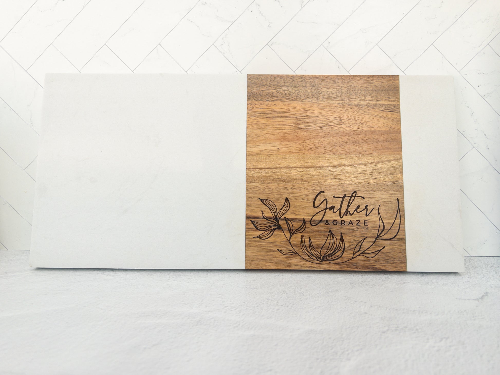 This handcrafted serving board features a striking contrast of smooth white marble and rich acacia wood, creating a clean, contemporary look perfect for entertaining. The wood section is laser engraved with our Gather & Graze floral design, but it can also be customized with your family name, special phrase, or business logo for a personalized touch. Whether gifted or kept, it brings beauty and warmth to any kitchen, dining table, or event spread.