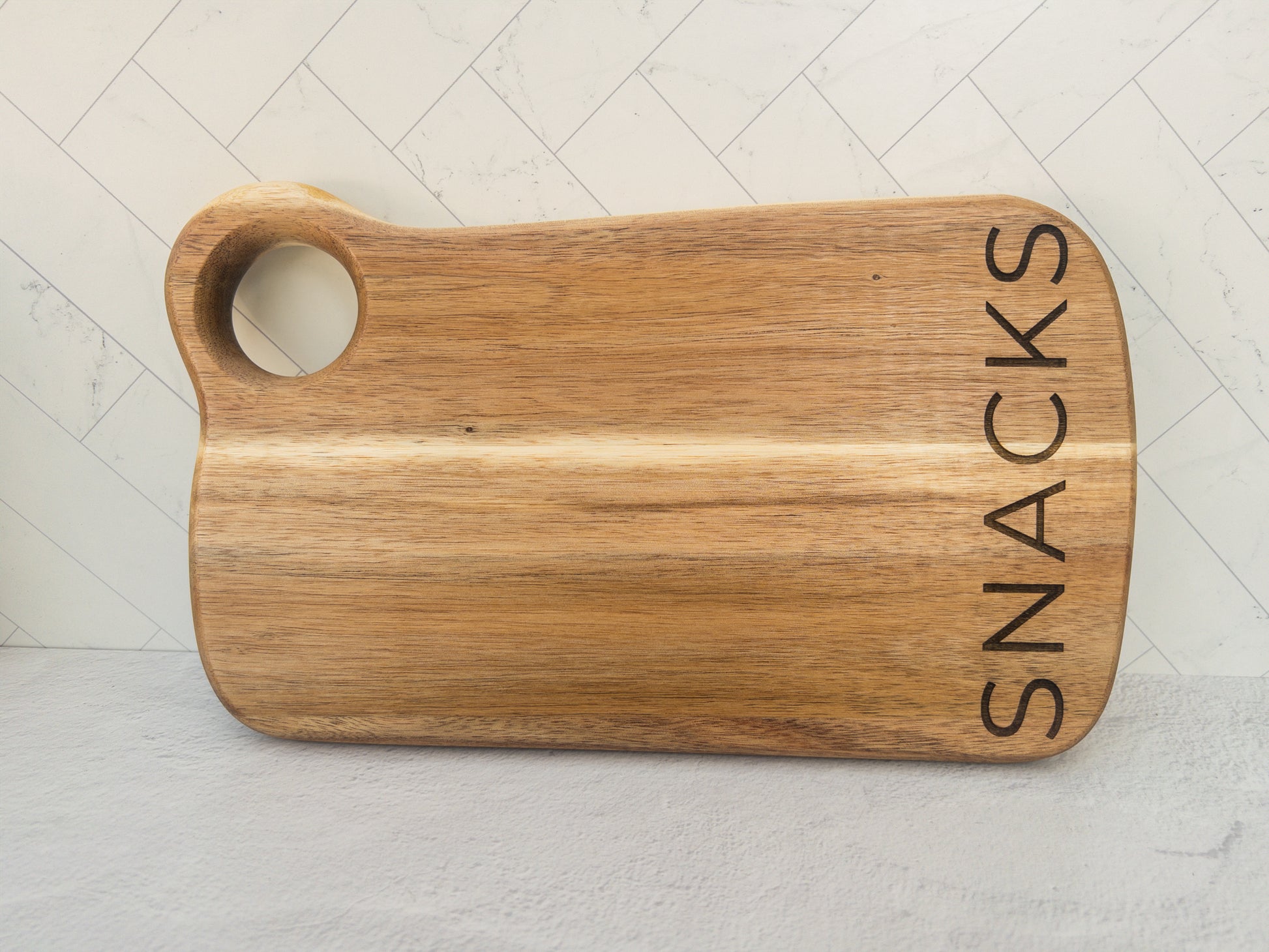 This handcrafted acacia serving board can be engraved with our clean modern SNACKS design or customized with your name, family name, or business logo. Whether gifted or kept, it adds a warm, natural touch to any kitchen, charcuterie spread, or gathering.