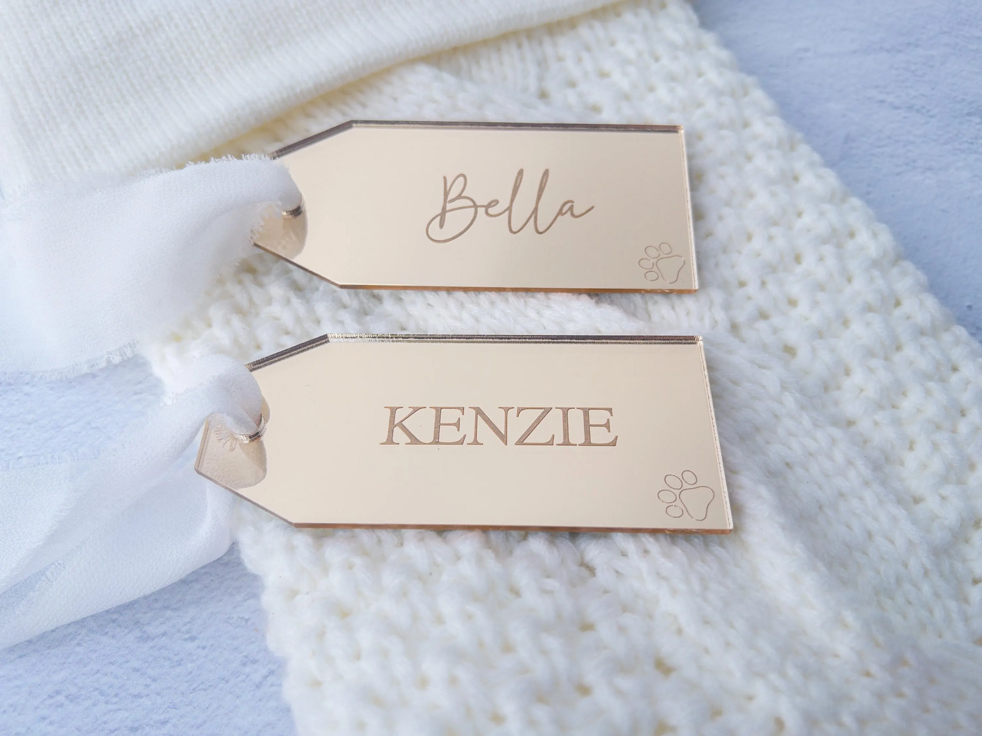 Crafted from premium mirrored gold acrylic and finished with soft chiffon ribbon, these tags catch the light beautifully and bring a polished, high-end look to any occasion.