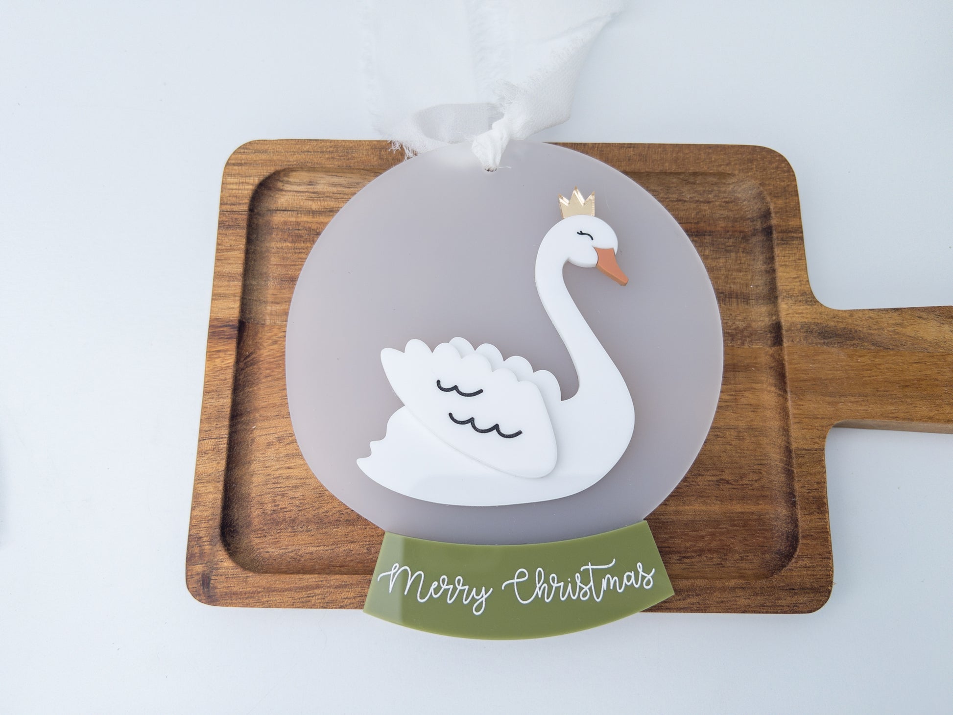 Graceful and timeless, this layered swan ornament brings a touch of elegance to your Christmas decor. Featuring a white acrylic swan with gold crown and an olive-green banner reading Merry Christmas, it’s perfect for neutral-toned or sophisticated holiday trees.